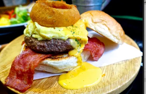溢出來的培根片、金黃起司片、超厚的牛肉漢堡、擠的相當漂亮的花生醬,