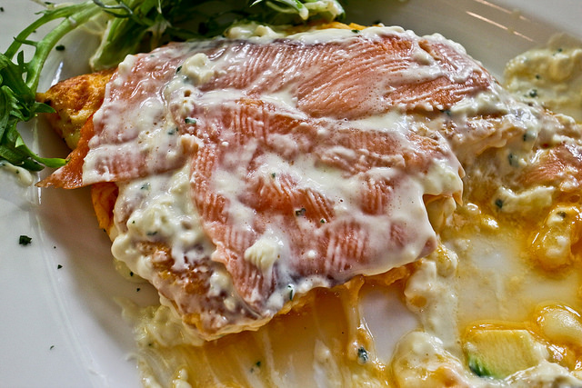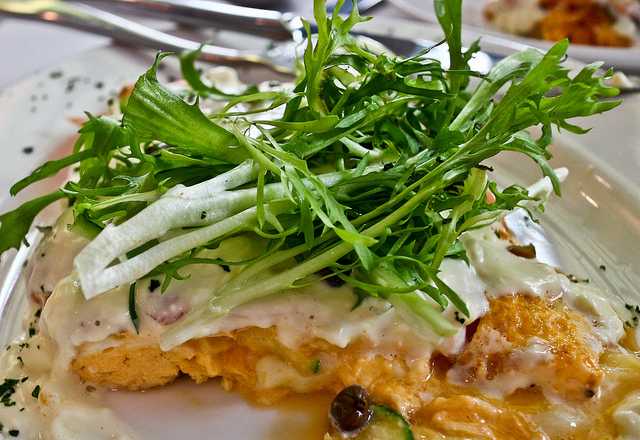 這道菜的組成是上面的香菜,很有厚度的cream cheese 接下來是煙燻鮭魚,最下面是蛋捲,蛋捲內與底層醬汁應該有另一種起司 ( 以菜單上就是Mozzarella )