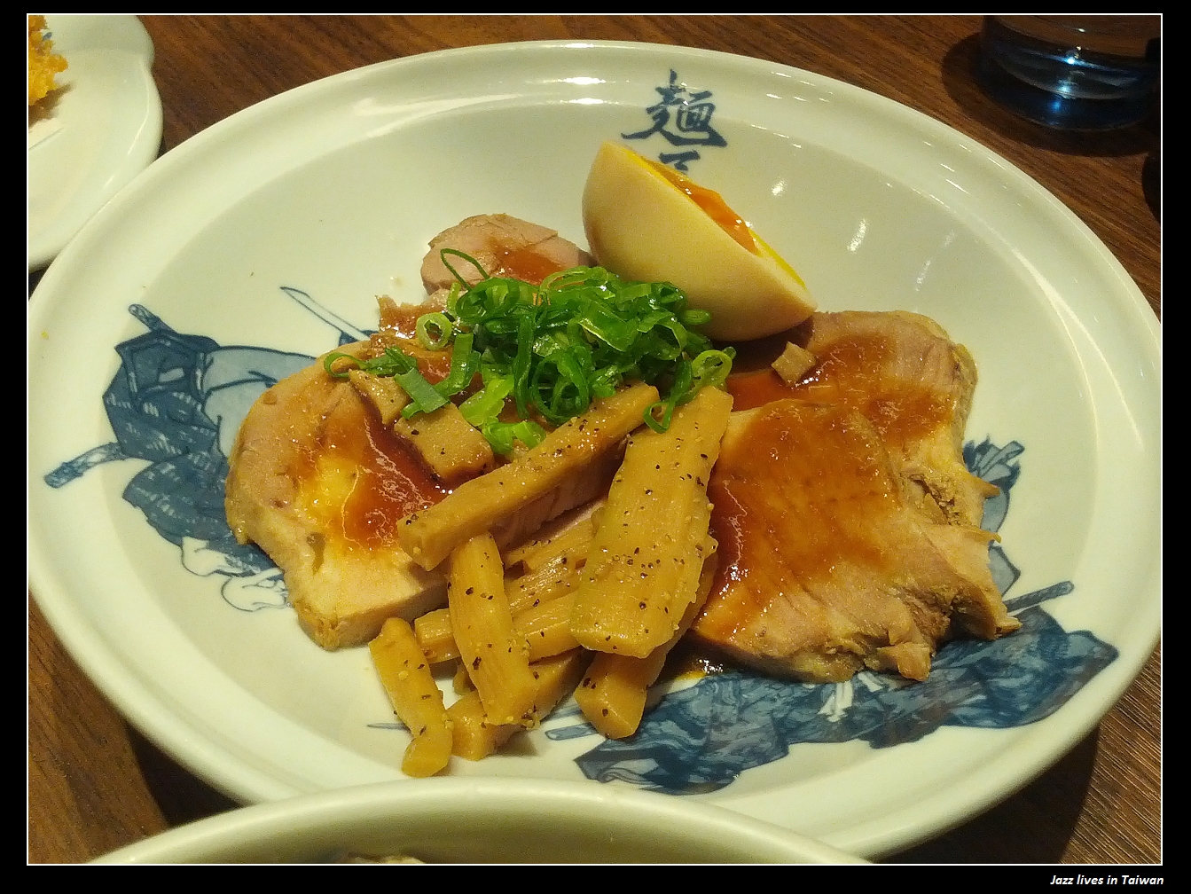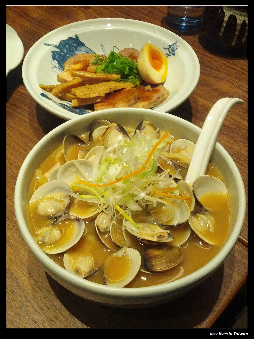 除了拉麵碗中的新鮮蛤蠣與海瓜子外, 一旁還附上日式叉燒, 筍乾與糖心蛋, 配菜上也是豪華的多重享受,