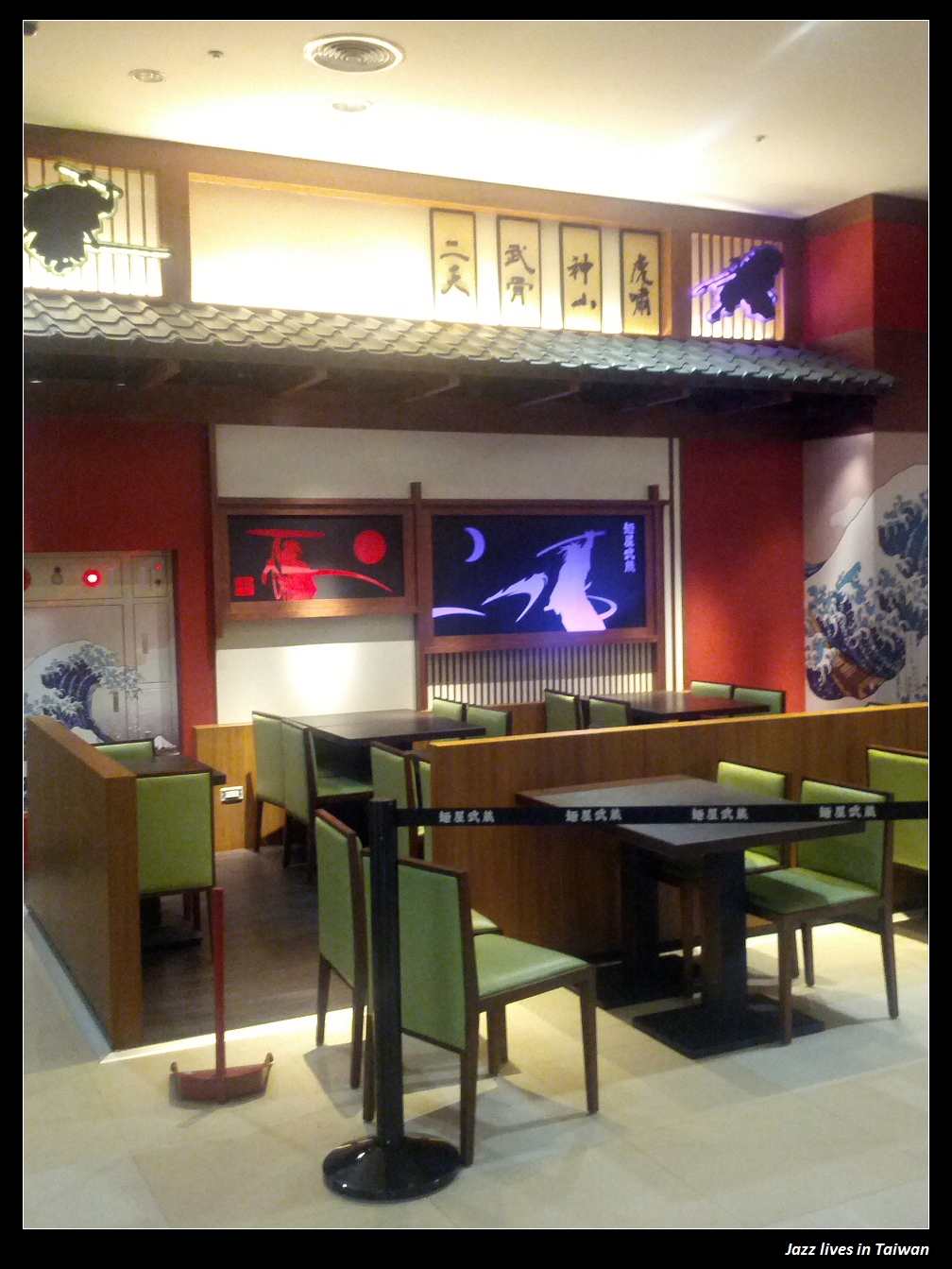 餐廳內牆上的裝潢與燈罩上都是武士的圖案與剪影, 依舊承襲著麵屋武藏的風格,