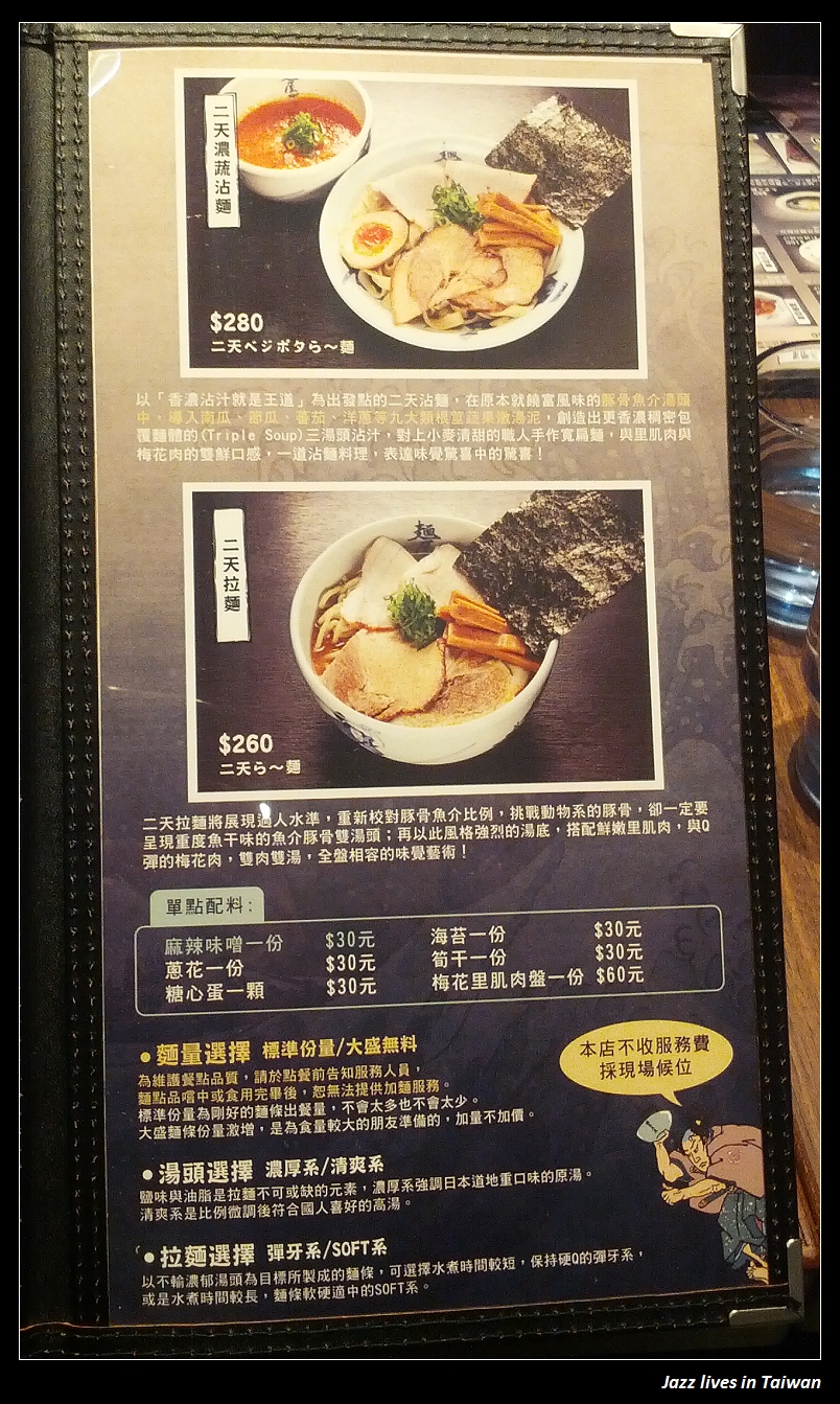 二天的菜單, 背面可以看到這是台灣的第四間麵屋武藏分店了, 分別是忠孝店虎嘯, 天津店神山, 左營店武骨與這中和店二天,