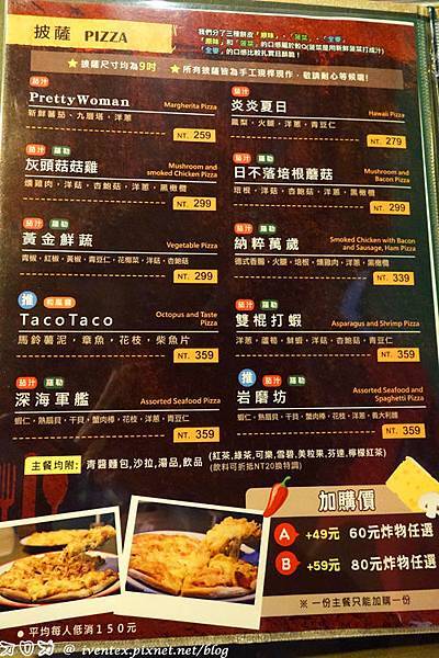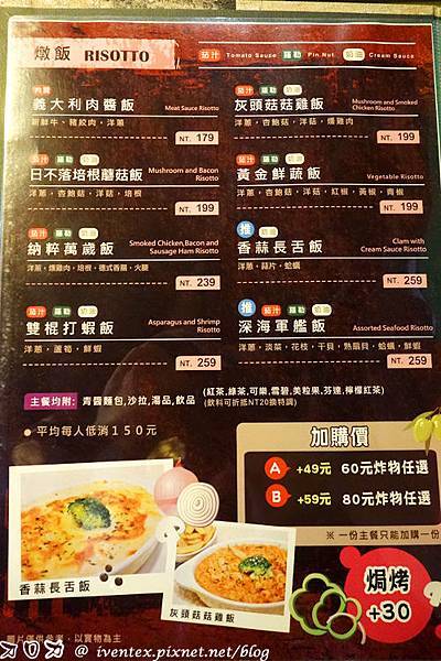 岩磨坊的餐點有手工Pizza(皆為9吋)、義大利麵、燉飯,每人低消為$150