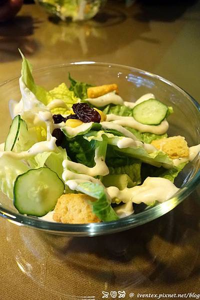 小黃瓜、蘿蔓、葡萄乾、麵包塊,淋上凱薩醬