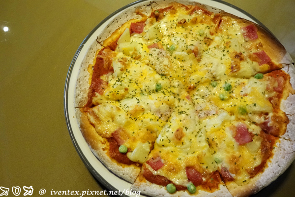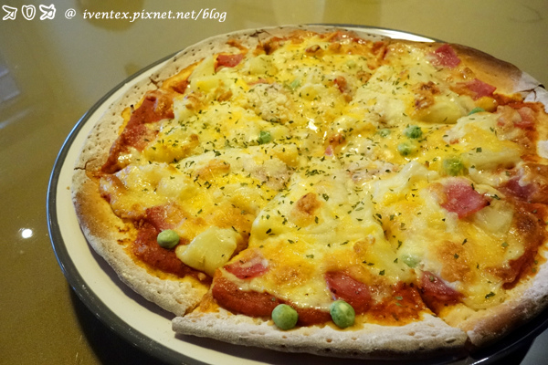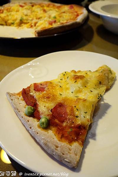 薄餅皮的Pizza很酥脆,一口接一口吃得很爽快
