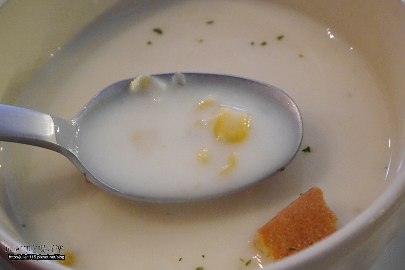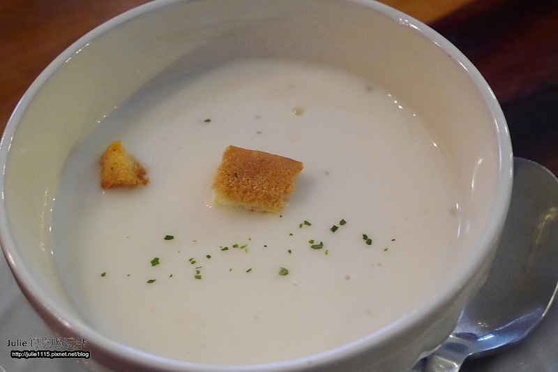 ↑這是J媽點的義大利麵套餐裡面附的濃湯,白色的湯,搭配一些些綠色的香料點綴。