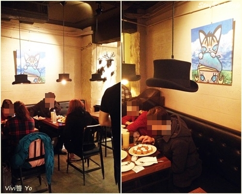 座位上方吊著紳士帽形狀燈罩,很像大家都戴了個帽子呢~