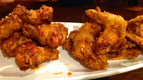 炸雞上也有放著幾條沾野醬汁的年糕.