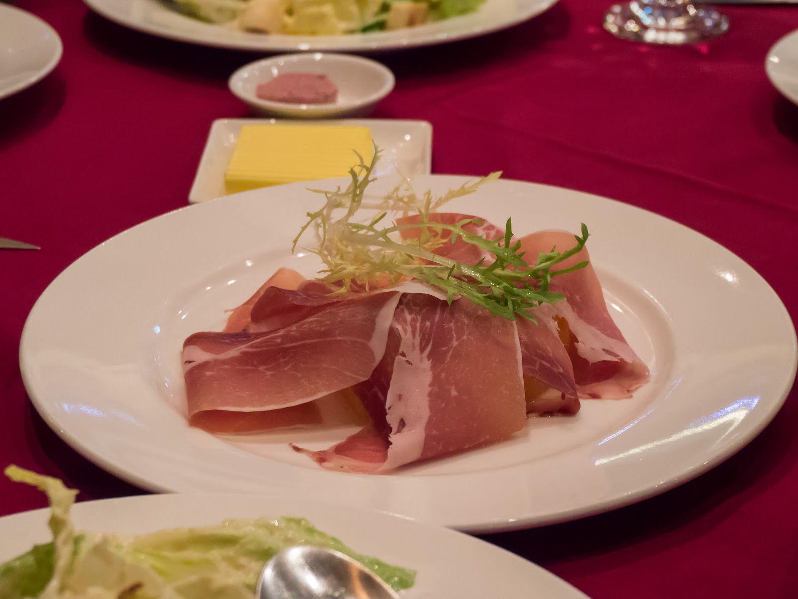 這道菜的特色在於在風乾火腿的下面,是哈密瓜,吃法是用火腿片把哈密瓜包起來吃!!