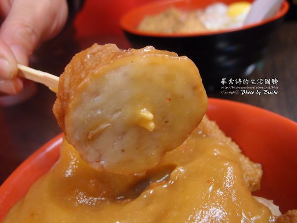 ▲首先,先從大吉甜不辣介紹吧!!大吉甜不辣由竹輪、雞捲、甜不辣(條狀)、甜不辣(片狀)、蘿蔔、貢丸、鱈魚丸、炸餛以及油豆腐組成,上面淋上的則是特製的味噌醬,口味沒有像甜辣醬那麼甜也少了一點辣味(這對愛辣成癡的小畢情何以堪)
