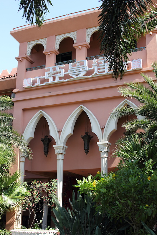 亞曼達會館位於恆春鎮往南灣的路上,其實不在南灣海灘前那一排民宿、旅館,而是再往恆春方向一些,到海灘大概十分鐘的步行路程。旅館外觀刷上淡紅色,外頭有許多植物、棕櫚樹包圍環繞,這是北非摩洛哥風格的旅館,據說是把摩洛哥王宮原封不動的移植到這裡,相當具有異國風情。