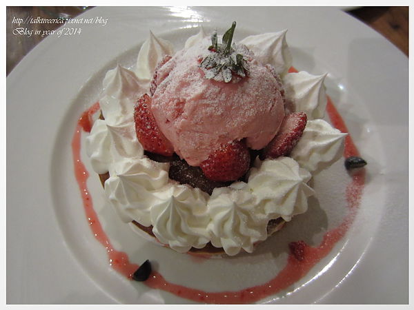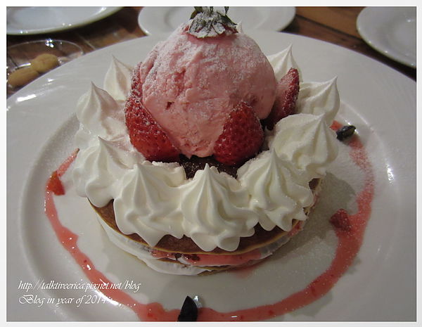 我們反而點了用新鮮草莓堆疊出的鬆餅塔