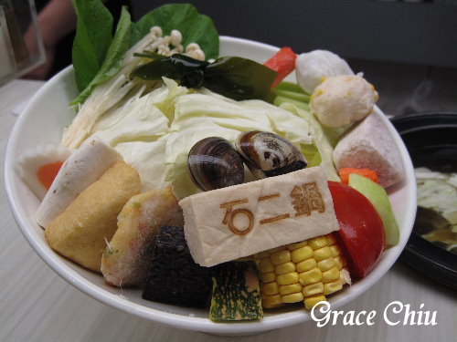 菜盤裡的料看起來都很新鮮,有鮮蔬.丸子.豆腐.火鍋料…等,蔬菜鮮甜,火鍋料可口但沒有個人感覺特別出色的,店名石二鍋字樣烙印在豆腐上,除了是擺盤裝飾的一種也是一種印象行銷.