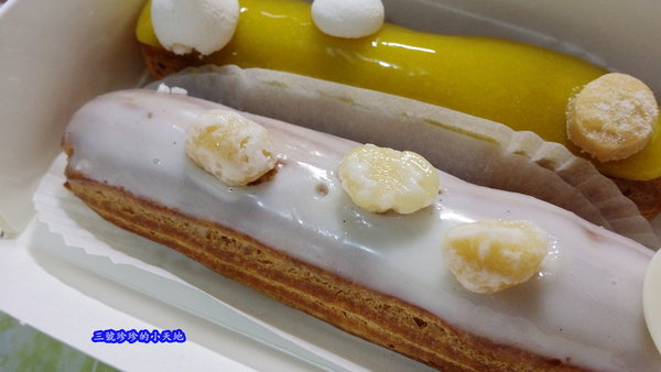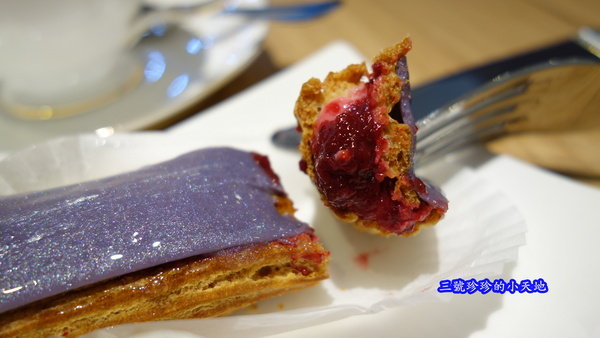 混合著藍莓還有覆盆子口味的卡士達醬,吃起來清甜再帶點微酸,以及外層翻糖有點黏牙的口感,整體吃起來還蠻好吃的耶!閃電泡芙的餅皮不是那種酥脆型的,會比較軟潤一些,但不影響泡芙整體的美味度。