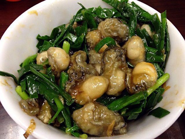 裹粉穿燙過後的蚵仔,再淋上油蔥 醬油與韭菜段