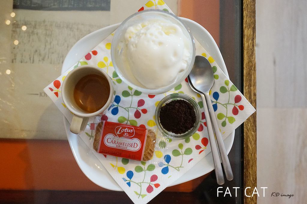 香蕉蛋糕的口感略偏厚實,烤得扎實,若喜歡海綿蛋糕口感的人可能要稍稍適應才是,不過香氣逼人配上奶油或是蜂蜜也挺好吃;阿法奇朵則是一份濃縮加上冰淇淋的組合,一冷一熱吃法相當多元,店家還灑上了些微的咖啡粉,讓口感味覺更添特別,既能單吃冰淇淋讓咖啡粉在口中迸出濃烈的苦,也能混合冰與咖啡,成了帶有香草味的濃郁濃縮咖啡。