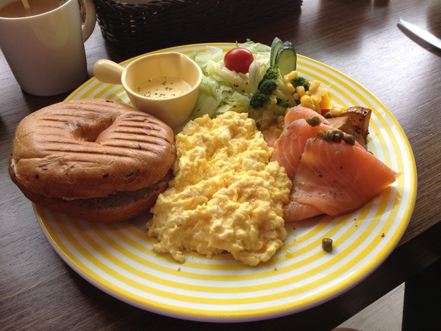 煙燻鮭魚($249 )搭配貝果、起司炒蛋