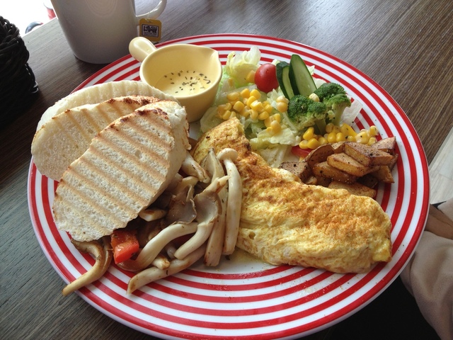 大致上的菜單是這樣,但有時也會有隱藏版料理。像用餐當日就有限量供應鴨胸($249 )。這裡的點餐法是:1. 點一道主菜(同時決定了價格)2. 選擇蛋料理(蛋捲、炒蛋、太陽蛋、兩面煎) 3. 選擇麵包 (軟法、貝果、丹麥、鮮奶土司)4. 選擇附餐飲料(咖啡、紅茶、綠茶、奶茶,均可續杯)