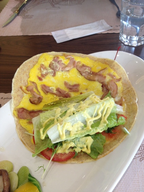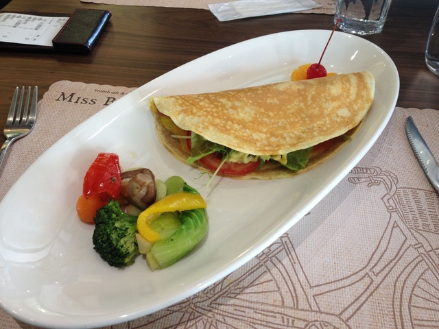 餡料非常豐富,而且蔬菜、肉、起司,營養均衡。餅皮形狀像墨西哥塔可餅Tacos、味道則較像雞蛋糕。有蛋香,邊緣脆脆的,中間口感較軟,但不爛。蔬菜口感清脆,燻雞很嫩,起司鹹香,芥末醬帶點甜味,並且充當了乳化劑,彼此相得益彰。一旁搭上水煮青菜,僅使用少數胡椒鹽調味,十分健康。