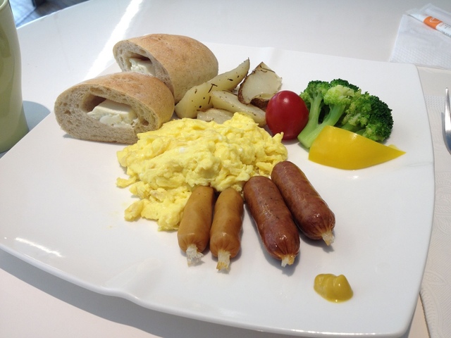 包含手工裸麥乳酪麵包、香腸/培根/火腿 三選一、馬鈴薯、太陽蛋/炒蛋。手工麵包很好吃,乳酪餡十分飽滿、濃稠,味道濃郁但不嗆鼻不刺口。麵包體保溼度足夠,咬起來有口感。香腸有兩種口味,黑胡椒和原味,不論是哪一種外皮都太硬了一點。炒蛋量蠻多的,但調味的有點重,略鹹。相反的,馬鈴薯雖有炒軟,但卻沒有什麼味道,兩者搭在一起吃倒也還不錯。