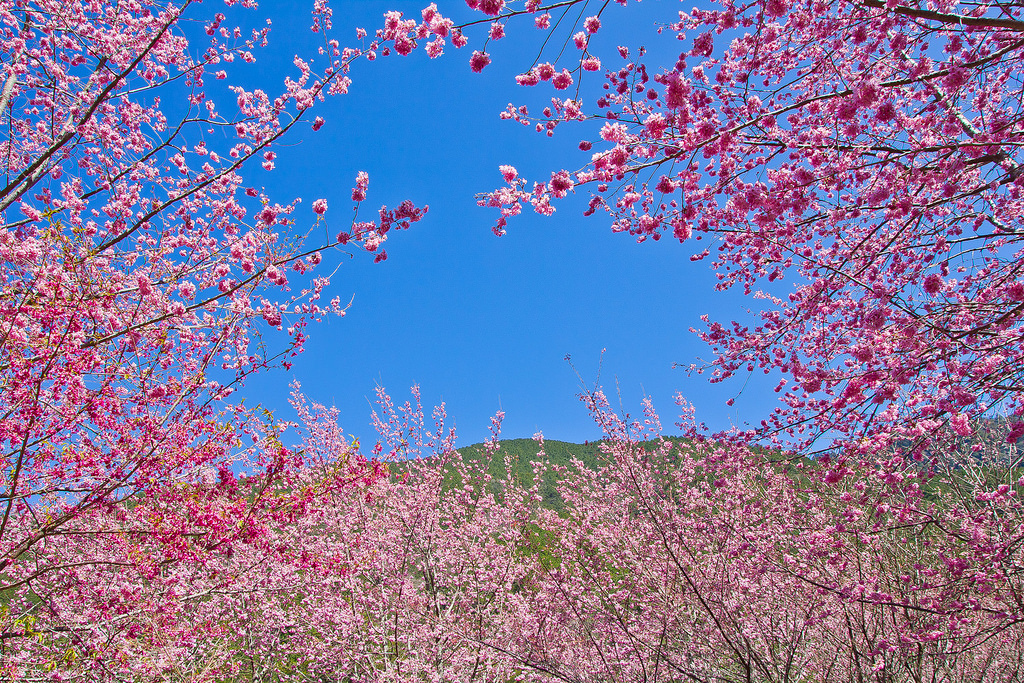 包圍構圖法,四周都是盛開的櫻花搭藍天景色