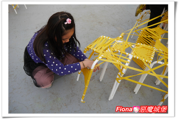 「纏繞成器」小屋在桌面與天花板上方都掛著不同的器具與線,可隨自己的想法將它們纏繞出喜愛的作品,Fiona在這區玩了好久,她好愛這種創意小遊戲~~