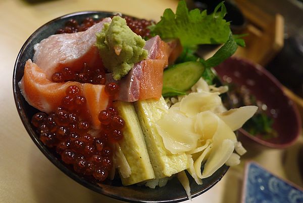 如果害怕吃生魚片的朋友,大力推炙燒鮭魚丼絕對是海鮮入門款,經噴槍炙燒的鮭魚表層充滿肥厚油脂,淋上香濃明太子沾醬,拿一片豪邁塞入口中(因為太大片XD)入。口。即。化的曼妙口感,讓美食家安妞妞第一口就說好吃耶!