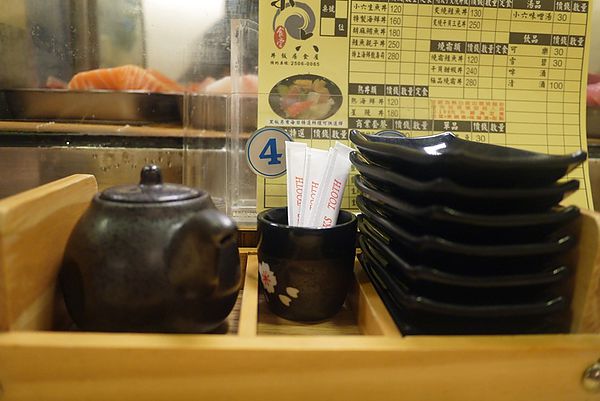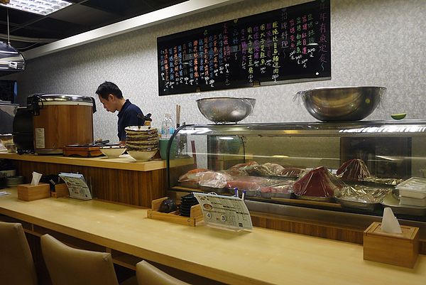 即使是平日中午,生意仍是好的不得了!開朗很幸運可以坐在切生魚片的吧台前,可以看著師傅毫不手軟切下厚度達1.5公分以上的生魚片,