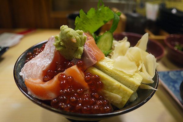 巨無霸厚切鮭魚長達1.5公分以上,渾圓剔透的魚卵直接鋪在丼飯上,氣勢超強!