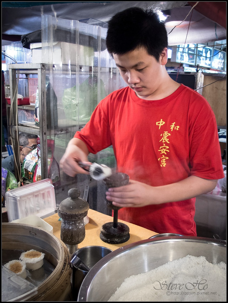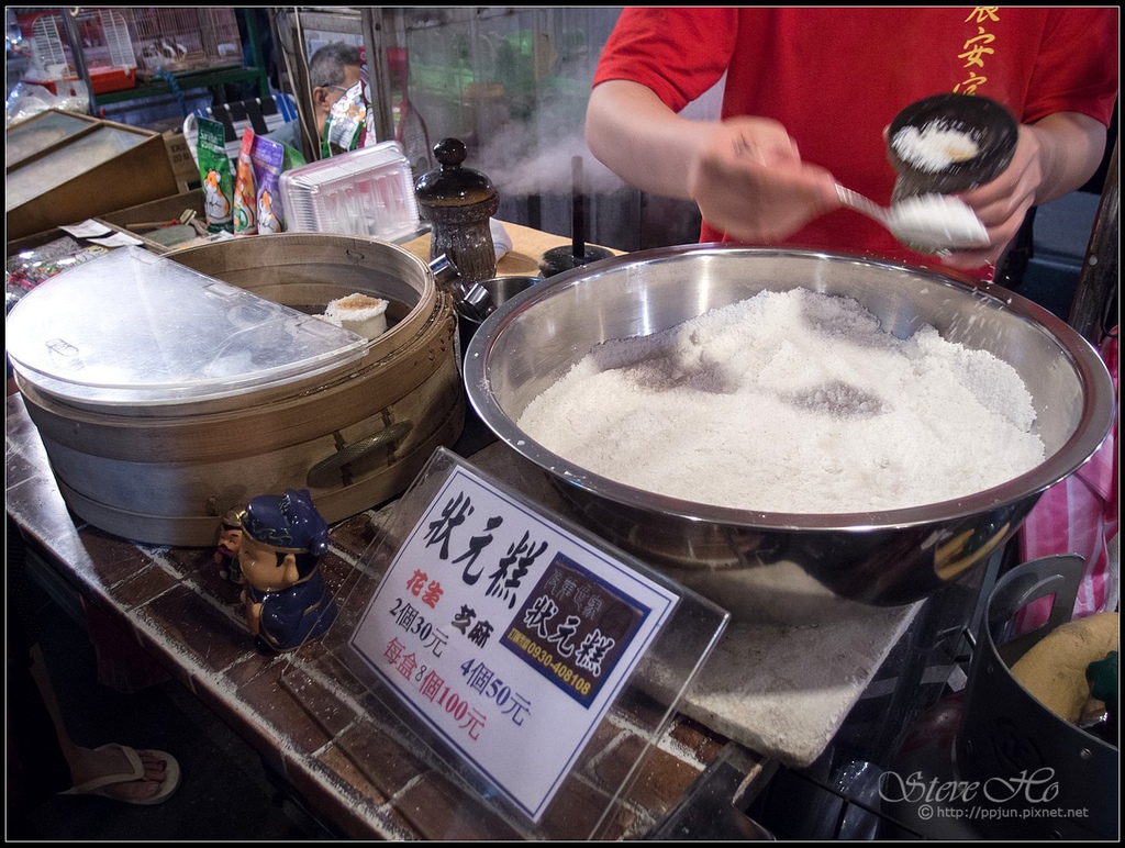 ▼狀元糕是將蓬萊米磨成漿後瀝掉水份,然後再磨成細粉為主要食材,餡料則有花生與芝麻二種口味