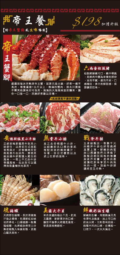 $198則是"帝王餐"的這頁菜單可以無限續點(但帝王蟹就不能加點)