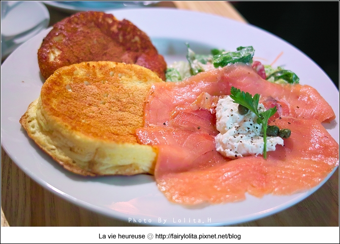 兩塊略有厚度的日式鬆餅、生菜沙拉、燻鮭魚肉,再佐以乳酪起士醬,不管是哪一種食材,所表現出來的滋味都具有相當水準。