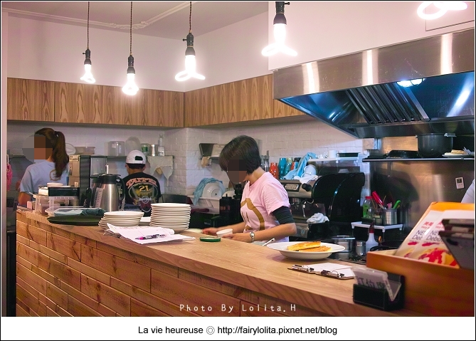 它的廚房是採用開放式設計,用餐時都可以看見服務人員在裡面忙碌穿梭的模樣,是說我覺得台灣人在服務態度方面算是蠻值得讚掌的,而日本人當然也不遑多讓囉!親切友善,連知道被拍照時,臉上都還掛著笑容,但基於個資法,我還是幫他們打個馬賽克好了XD