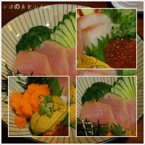 散壽司內容為旗魚片,海鱺魚,蝦卵,加拿大海膽,鮭魚卵