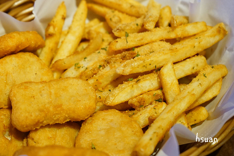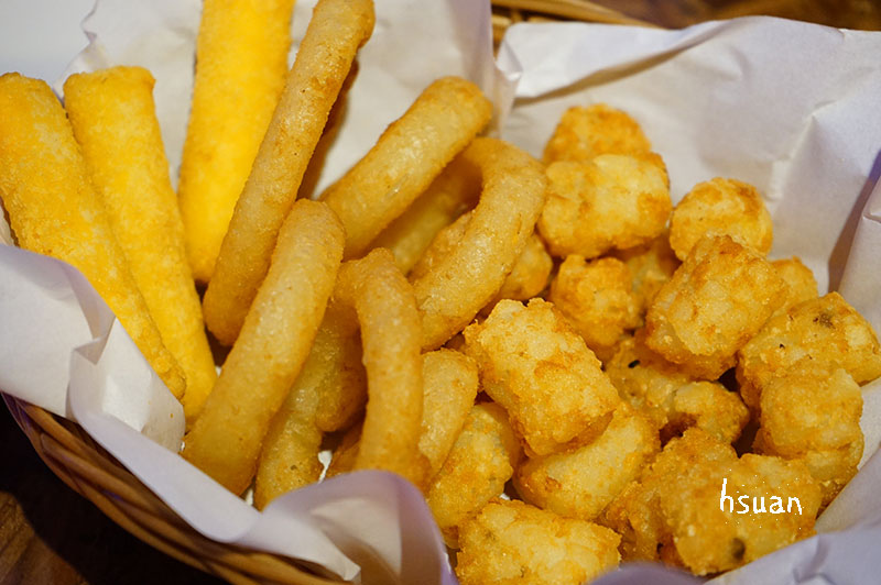 拼盤裡有起司條 洋蔥圈 還有薯球