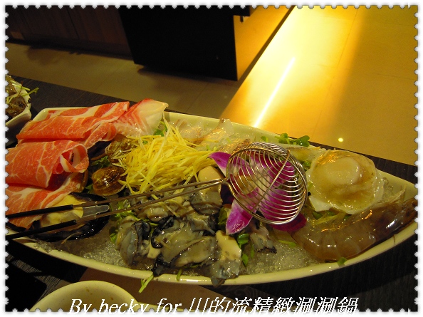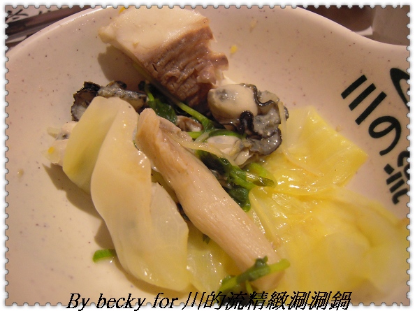 把菜盤的東西丟進去後,我們點的海鮮及小海陸上桌了~海鮮有蝦子、魚片、蛤蜊、扇貝、透抽、蚵仔及曼波魚:小海陸的海鮮少了曼波魚,但多了淡菜加上豬肉片。