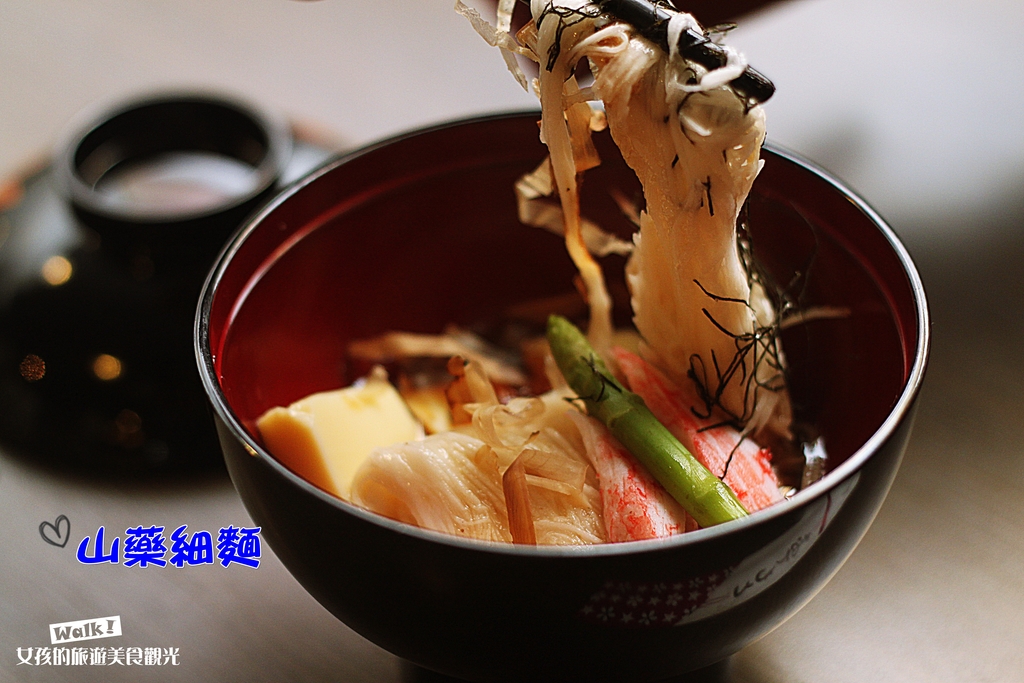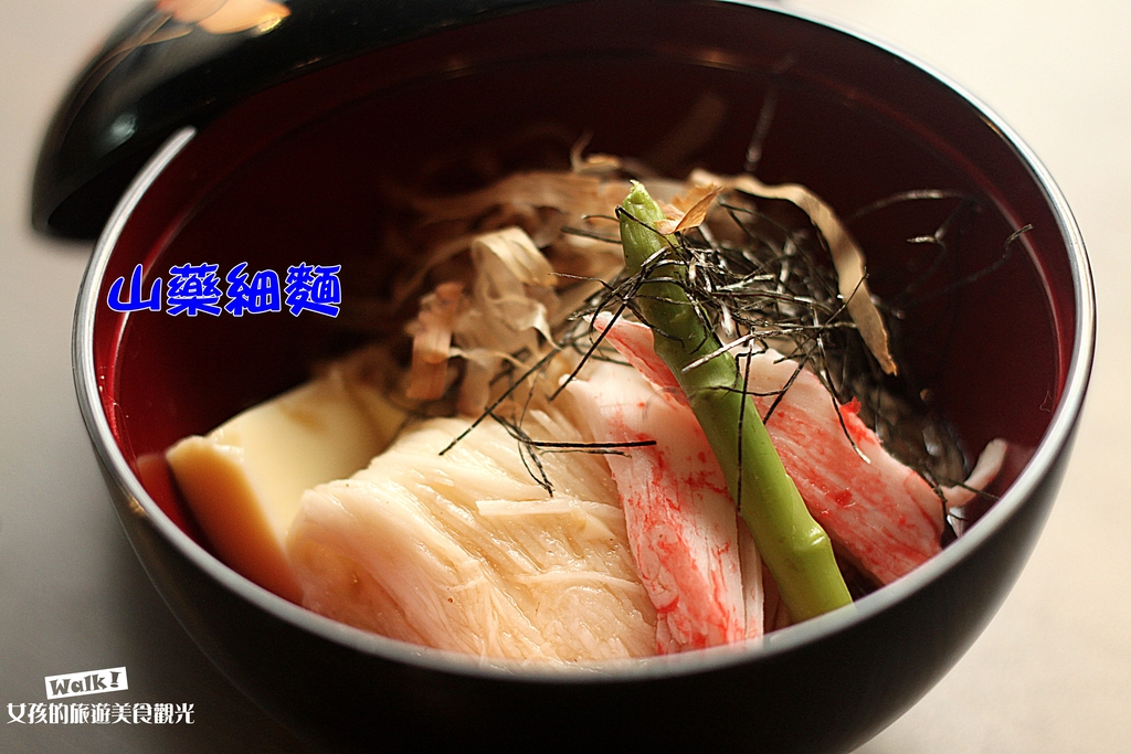 將日本山藥削成細細長長,如同細麵一般的模樣,白白淨淨的鋪展在醬汁上,
