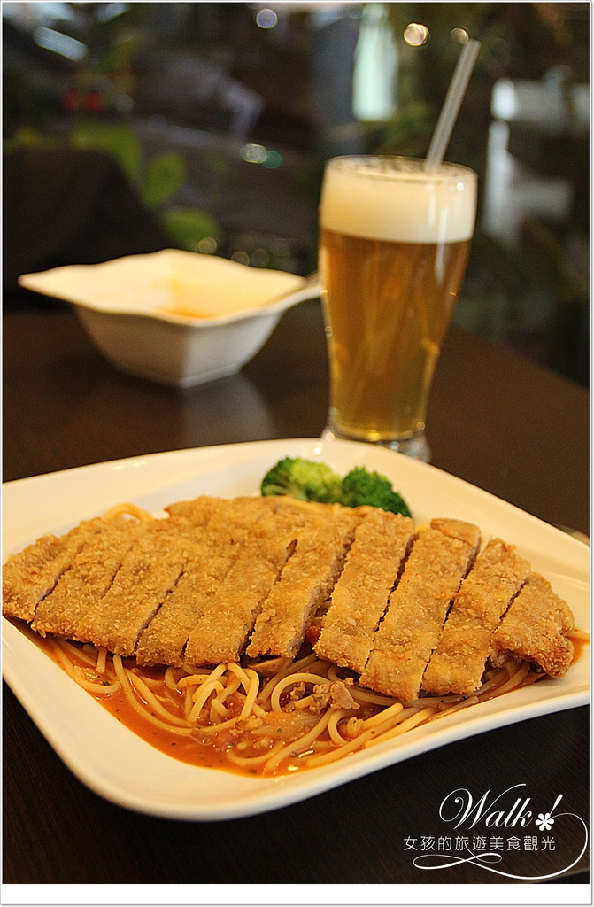 奇馬司的肉醬義大利麵不僅式肉醬,他還有主食:大塊豬排