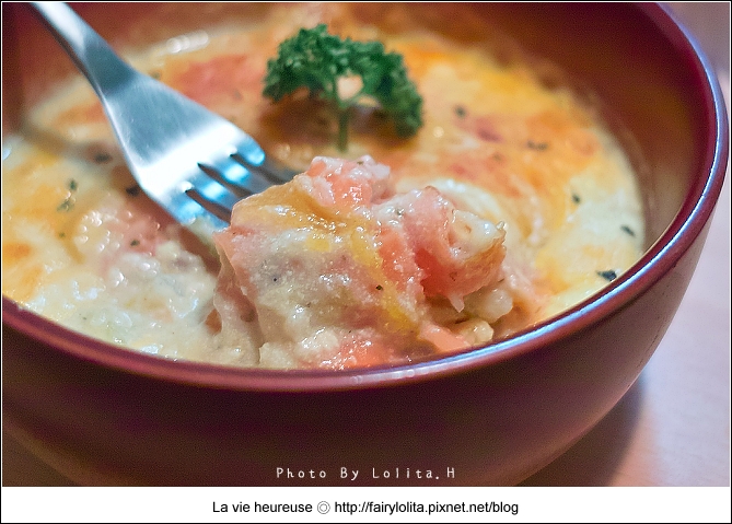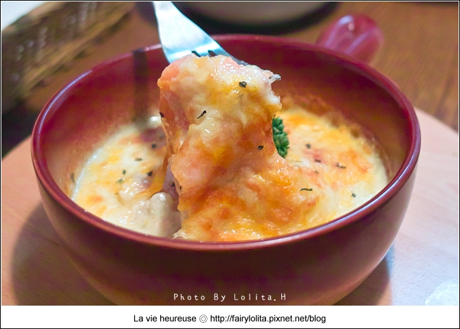 焗烤烤得焦黃橙橘,色澤給人一種食指大動的魔力,雖然賣相佳,但份量卻少得讓我跟小牛傻眼,活脫像極了小朋友在用的兒童餐,磁鍋小就算了,連厚度也很淺,雖然吃起來還不錯,但完全吃不飽呀!!(摔筆)