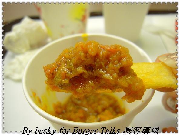 而後,老闆還問說吃不吃牛肉,因為他很推薦,不過因中午已經吃過牛肉,所以我才點豬肉,老闆就說,他們的東岸牛肉堡的醬汁很棒,於是特地給了墨西哥肉醬,讓我來沾脆薯,因為很多歐美人都喜歡沾著大量肉醬來吃,所以他也想讓大家試試,肉醬的口感有點類似義大利肉醬,但吃在嘴裡又有輕微的辣味。