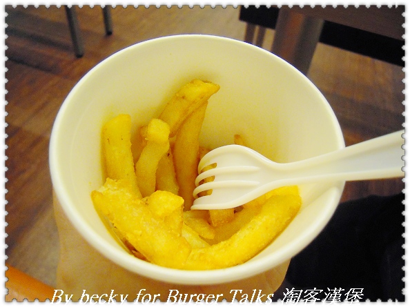 等待同時,先嚐了黃金脆薯:用杯子裝的黃金脆薯口感很脆,現炸的薯條吃起來很有嚼勁,原味吃就很有淡淡的味道,還附上叉子讓客人可以不用手去拿。