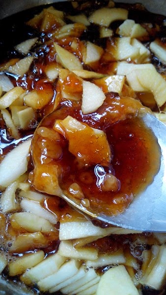 因為沒有添加粉類勾芡也不加水充量,所以蘋果用量很高,每天削蘋果切蘋果熬煮的時間,差不多要三到四小時,製作時一定要挑選新鮮的水果,不論是熬煮焦糖或果醬,都要注意火侯以免過焦。