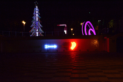 水池上的聖誕樹跟半心,這個場景有用圍欄圍起,所以只能在一定的