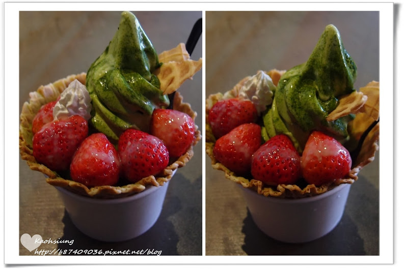 這裡的抹茶不是霜淇淋 因為上頭還撒了抹茶粉所以取名「粉淇淋」 連名稱都硬要跟別人不同XD