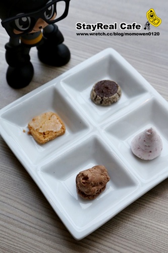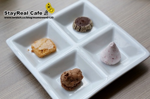 四宮格的法式小餅送上桌時我們都超high的… 這擺飾也太讓人捨不得動手… 在食用之前還左看右了一陣子才小心翼翼的取用… 而口感也相當特別又帶有香氣… |