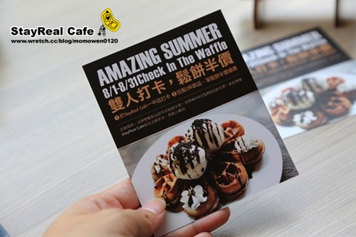 | | 說到美味的鬆餅馬上就看到這張小卡… StayReal Cafe by GABEE一中店自8/1~8/31號有獨家「雙人打卡,鬆餅半價」的活動… 只要在店裡消費雙數的飲品再加上打卡就可享有鬆餅半價的優惠… wow~~這麼棒又優惠的價格當然是要趕快衝SRC了呀!… |