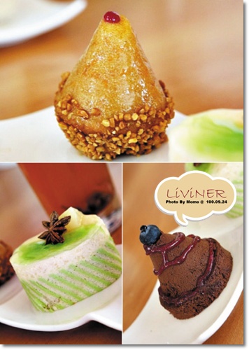 | | 第二輪的甜品前至後分別是:「蜜芙塔」、「栗芭薇」、「歐爵」… 畫面看起來是高、中、低的排列,好可愛哦… |