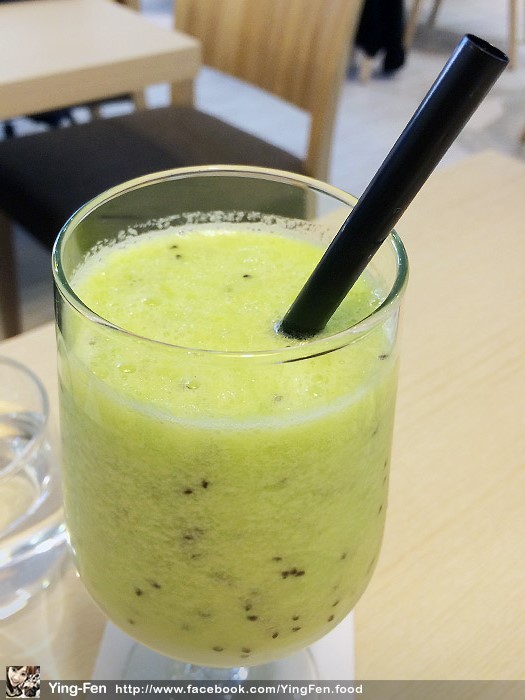 採用新鮮水果現打的奇異果汁,還可以吃到果肉的果汁非常好喝,所以需要粗的吸管喔!