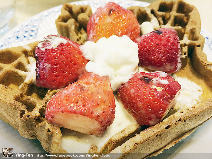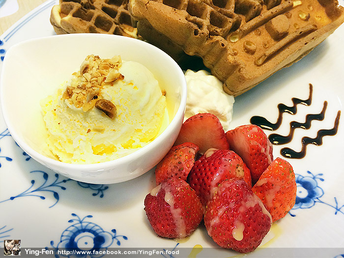 每個草莓上面都有加上紅莓果醬和香濃的煉乳,草莓吃起來酸酸甜甜有乳香味道,旁邊有少許的巧克力醬、鮮奶油和冰淇淋,冰淇淋上面有放幾粒堅果,吃冰淇淋會有不同的口感呈現。