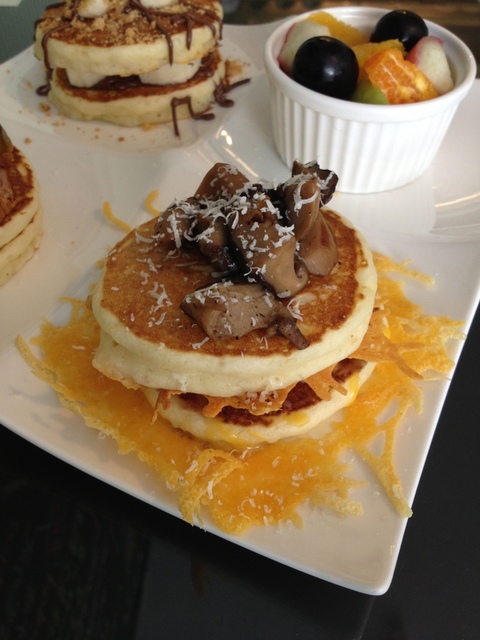 第二次的時候一樣是選了美式煎餅組合,這次的口味是:厚火腿菇菇、臭起司焦洋蔥、香蕉巧克力。(當天因為店家備料問題,洋蔥沒有了,所以店家幫我改成臭起司菇菇)