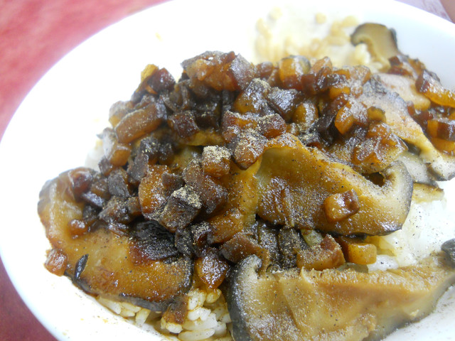 這張照片是早些日子小虎前去用餐時用手機拍的(那時沒有相機),基本上這家魯肉飯有兩種選擇,↑上圖是單純的魯肉飯(20元),↓下圖則是香菇魯肉飯(55元)